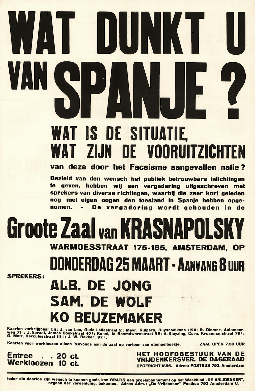Dat was de tekst behorende bij een uitnodiging voor een bijeenkomst over de Spaanse Burgeroorlog op 25 maart 1937.