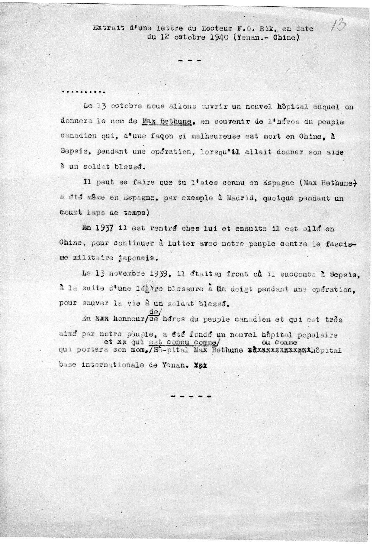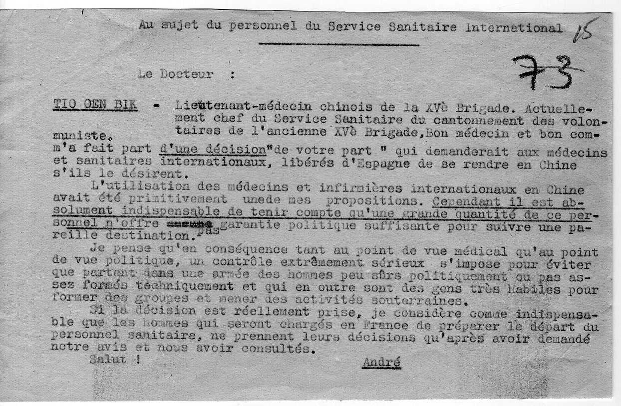 De twee volgende documenten uit het Kominternarchief (RGASPI. F.545. Op.6. D.580) tonen een brief van Andre Marty over het voornemen van Tio Oen Bik om naar China te gaan en een extract van een brief van Tio Oen Bik uit Yenan in China, waar in hij schrijft over de Canadese arts Normand Bethune die ook in Spanje was geweest.