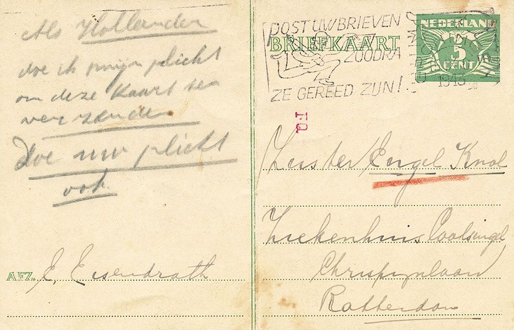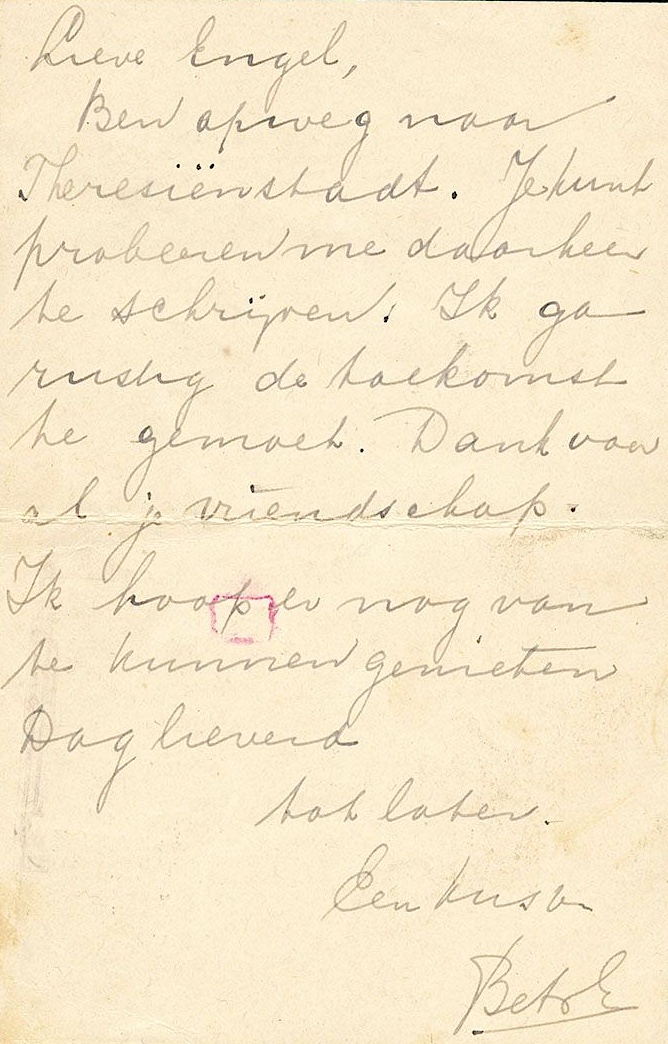 Het laatste bericht van haar is een briefkaart die zij uit de trein heeft geworpen toen zij op transport was gesteld naar Theresiënstadt, gericht aan haar vriendin Engel Knol.