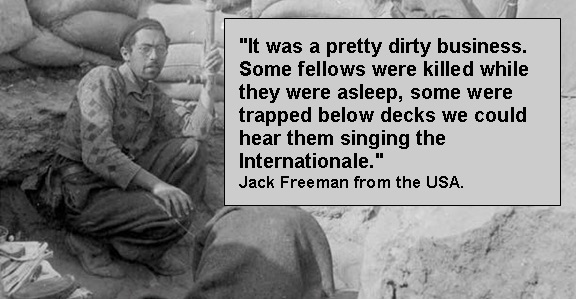 “Het was een nogal smerige aangelegenheid. Sommige jongens werden gedood toen ze lagen te slapen, anderen werden benedendeks ingesloten en we hoorden ze de Internationale zingen”Jack Freeman uit de USA.