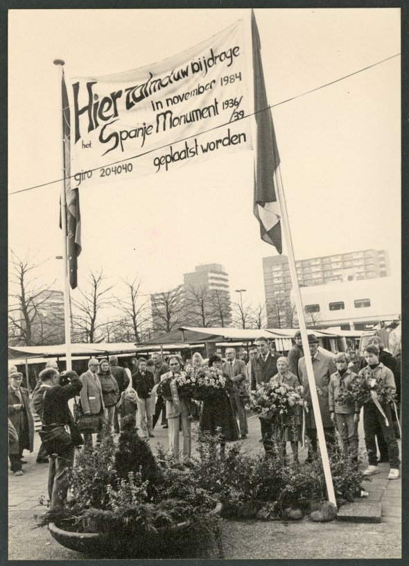 Er is toendertijd in de periode 1984 -1986 veel moeite gedaan om geld te verzamelen voor een Spanje-monument in Amsterdam. Op onderstaande foto is een spandoek te zien met een oproep om te doneren.