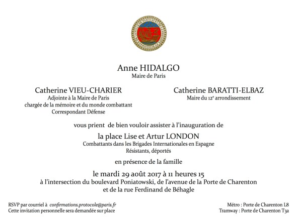 Aanstaande 29 augustus wordt er in Parijs een plein onthuld ter ere van Lise en Artur London, in het twaalfde arrondissement in aanwezigheid van de burgemeester van Parijs Anne Hidalgo.
