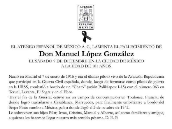Wij hebben bericht ontvangen dat zaterdag 9 december in Mexico op de leeftijd van 101 jaar de laatste republikeinse piloot is overleden: Don Manuel Lopez Gonzalez.