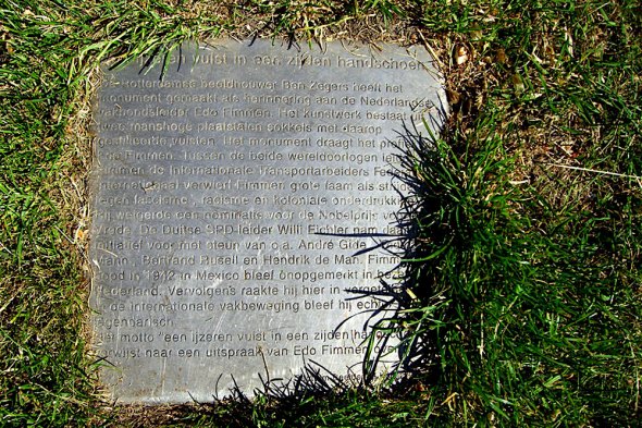 De Rotterdamse beeldhouwer Ben Zegers heeft het monument gemaakt als herinnering aan de Nederlandse vakbondsleider Edo Fimmen. Het kunstwerk bestaat uit twee manshoge plaatstalen sokkels met daarop gestileerde vuisten. Het monument draagt het profiel van Edo Fimmen. Tussen de beide wereldoorlogen leidde Fimmen de Internationale Transportarbeiders Federatie. Internationaal verwierf Fimmen grote naam als strijder tegen fascisme, racisme en koloniale onderdrukking. Hij weigerde een nominatie voor de Nobelprijs voor de Vrede. De Duitse SPD-leider Willi Fichler nam daar het initiatief voor met steun van o.a. André Gide, Thomas Mann, Bertrand Russell en Hendrik de Man. Fimmens dood in 1942 in Mexico bleef onopgemerkt in bezet Nederland. Vervolgens raakte hij hier in vergetelheid. In de internationale vakbeweging bleef hij echter legendarisch.