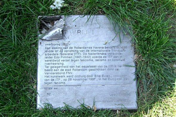 Ter gelegenheid van het eeuwfeest van de ITF is het beeld aan de stad Rotterdam geschonken door de Vervoersbond FNV.