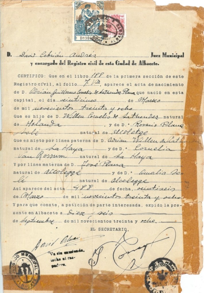 Haar opa, de eerste Nederlander die naar Spanje was vertrokken, vlak na het begin van de Spaanse burgeroorlog. Die meteen gewond raakt en in het hospitaal van Lerida terecht komt waar hij maandenlang verzorgd wordt door de 26- jarige verpleegster Rosario Plana. Haar oma dus. De twee trouwen, maken in de zomer van ’37 een korte reis naar Nederland, gaan terug naar Spanje en Rosario blijkt in verwachting. Op 25 maart wordt Adrián Guillermo Cornelis de Lathouder Plana geboren, haar vader dus. Midden in de oorlog in het plaatsje Albacete, het hoofdkwartier van de Internationale Brigaden waar haar oma Rosario in het ziekenhuis werkt en haar opa Willy – zoals hij genoemd wordt – een baan heeft bij de persdienst. Drie maanden na de geboorte van haar vader sterft haar opa aan het front van de Ebro.