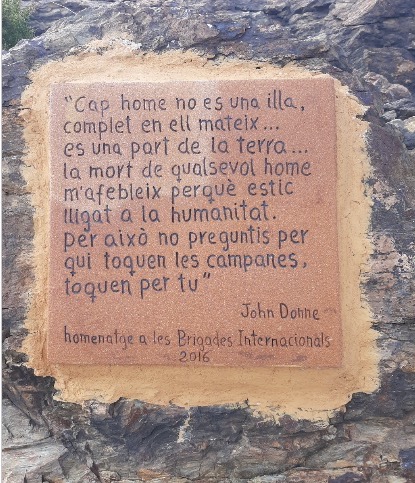 En ineens is daar die steen, vlak naast een reeks officiële monumenten die herinneren aan de Retirada. De steen is wat slordig tegen een rots gemetseld, hier is zeker geen ervaren metselaar aan het werk geweest. Wie in 2016 de steen er aangebracht heeft, blijft al met al een groot raadsel. Het gedicht dat erop staat, in het Catalaans, zal echter nooit verloren gegaan en is een ode aan de Internationale Brigades. De duizenden vrijwilligers die naar het Republikeinse front trokken, maakten bijna allemaal kennis met Portbou. Ze stapten er, komend uit Frankrijk, over in gereedstaande Spaanse treinen.